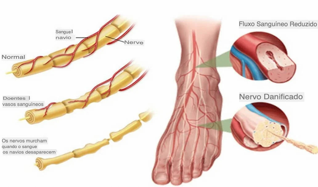 O excesso de açúcar no sangue diminui a elasticidade dos vasos sanguíneos e faz com que se estreitem ainda mais – o que restringe ainda mais o fluxo sanguíneo para os nervos dos pés.